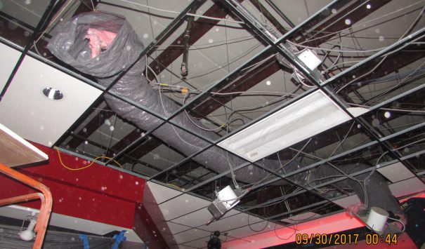 Because of the carbon buildup in the ceiling, all the ceiling tiles were replaced to help assure safe air quality for future bowlers. All the devices and surfaces in the facility were decontaminated and detail treated.